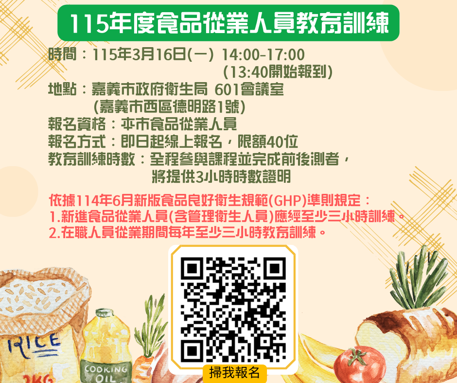 115年度食品從業人員教育訓練3月場開放報名 食品衛生安全從基本做起! 嘉義市政府衛生局辦理「115年度食品從業人員教育訓練」3月場, 即日起開放報名,歡迎本市食品相關從業人員踴躍參加。 時間:115年3月16日(一)14:00–17:00 (13:40開始報到) 地點:嘉義市政府衛生局6樓-601會議室 (嘉義市西區德明路1號) 教育訓練時數:全程參與課程並完成前後測者,將提供3小時時數證明 活動費用:免費 報名方式:即日起線上報名,限額40位 線上報名連結: https://health.chiayi.gov.tw/ActiveList.aspx?n=4630...... 洽詢專線:05 2338066 分機726 黃小姐 名額有限,請把握機會,提升食品衛生知能,一起守護消費者食的安全!